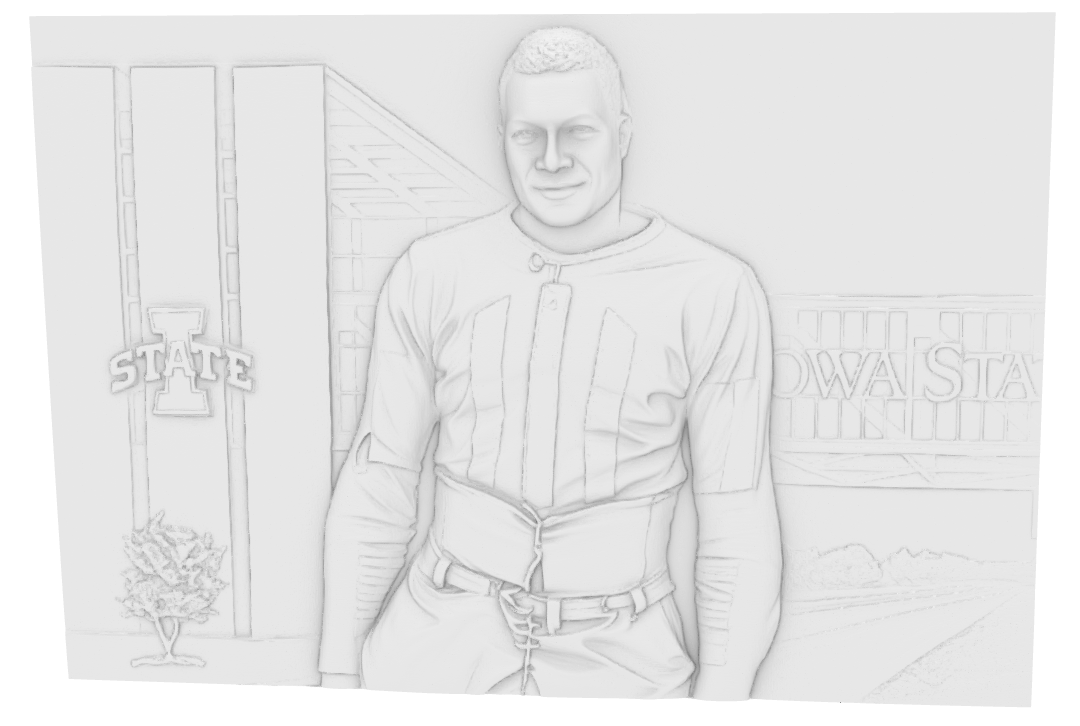 This piece was designed by the Artscapes team for an Iowa State University alum. An original work inspired by Christen Petersen, this high relief depicts Jack Trice in front of the Iowa State University pedestrian bridge leading to the stadium dedicated in his honor.